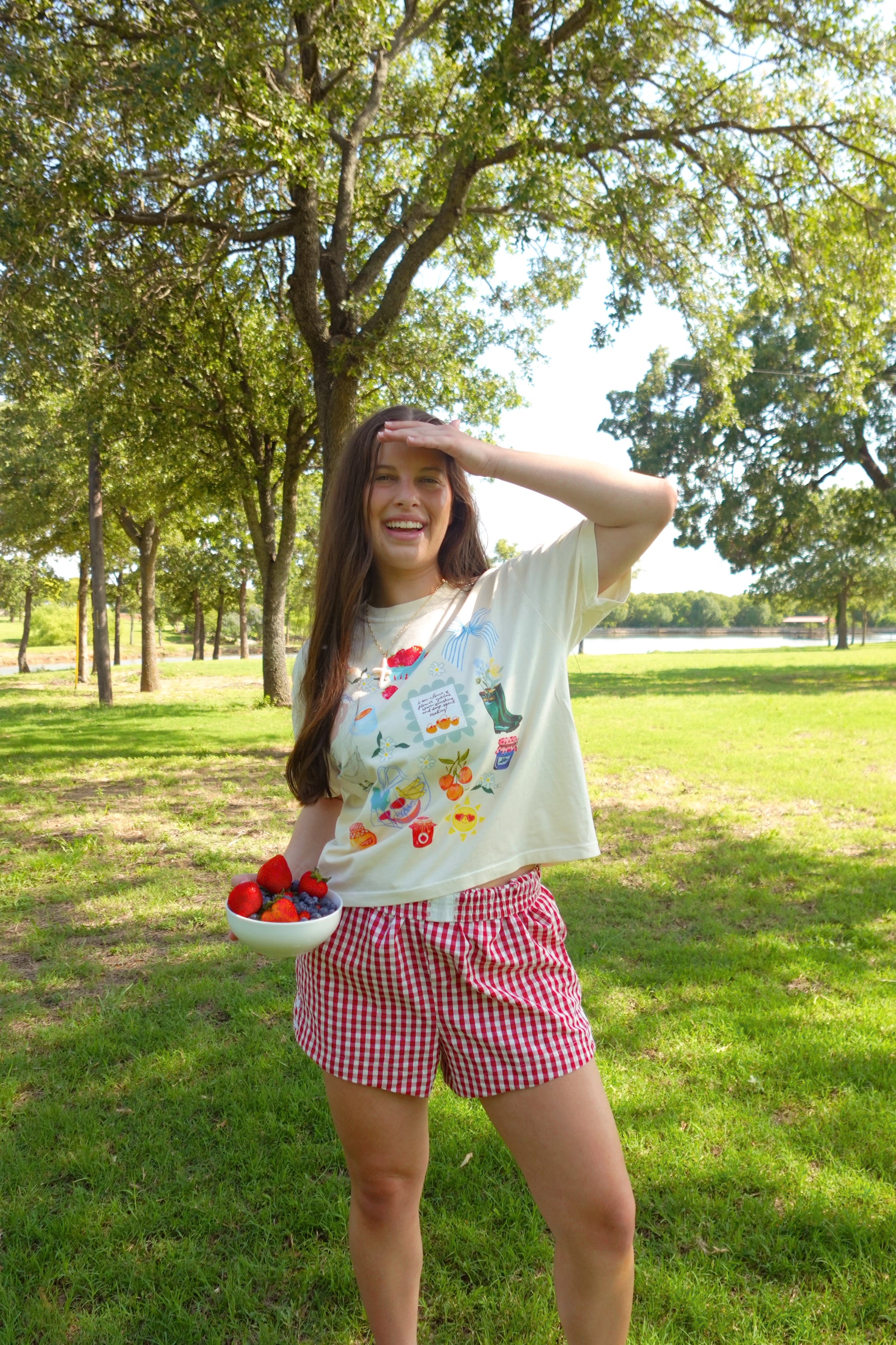 Experience the joy of summer with a popular summer collage tee!! A comfortable mid-crop tee made from 100% ring-spun cotton.